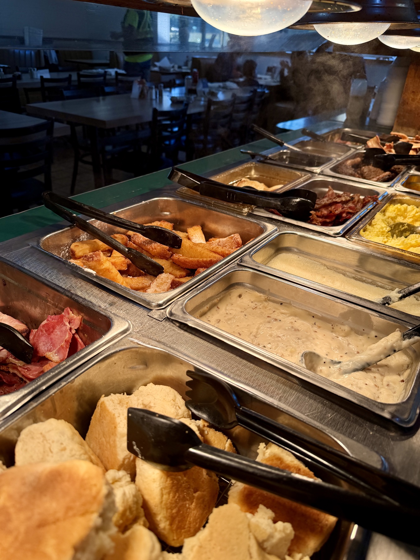 MorningEggs, bacon, sausage, country ham, grits, biscuits & gravy, pancakes, fruit — and a whole lot more every morning.