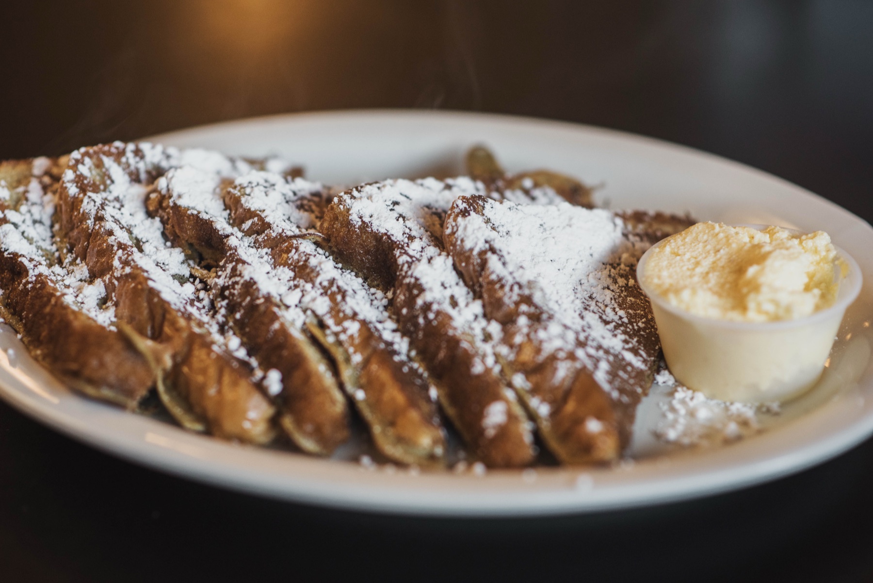 MorningThick-cut, griddled crisp, powdered sugar on top. Maple syrup and butter on the side.