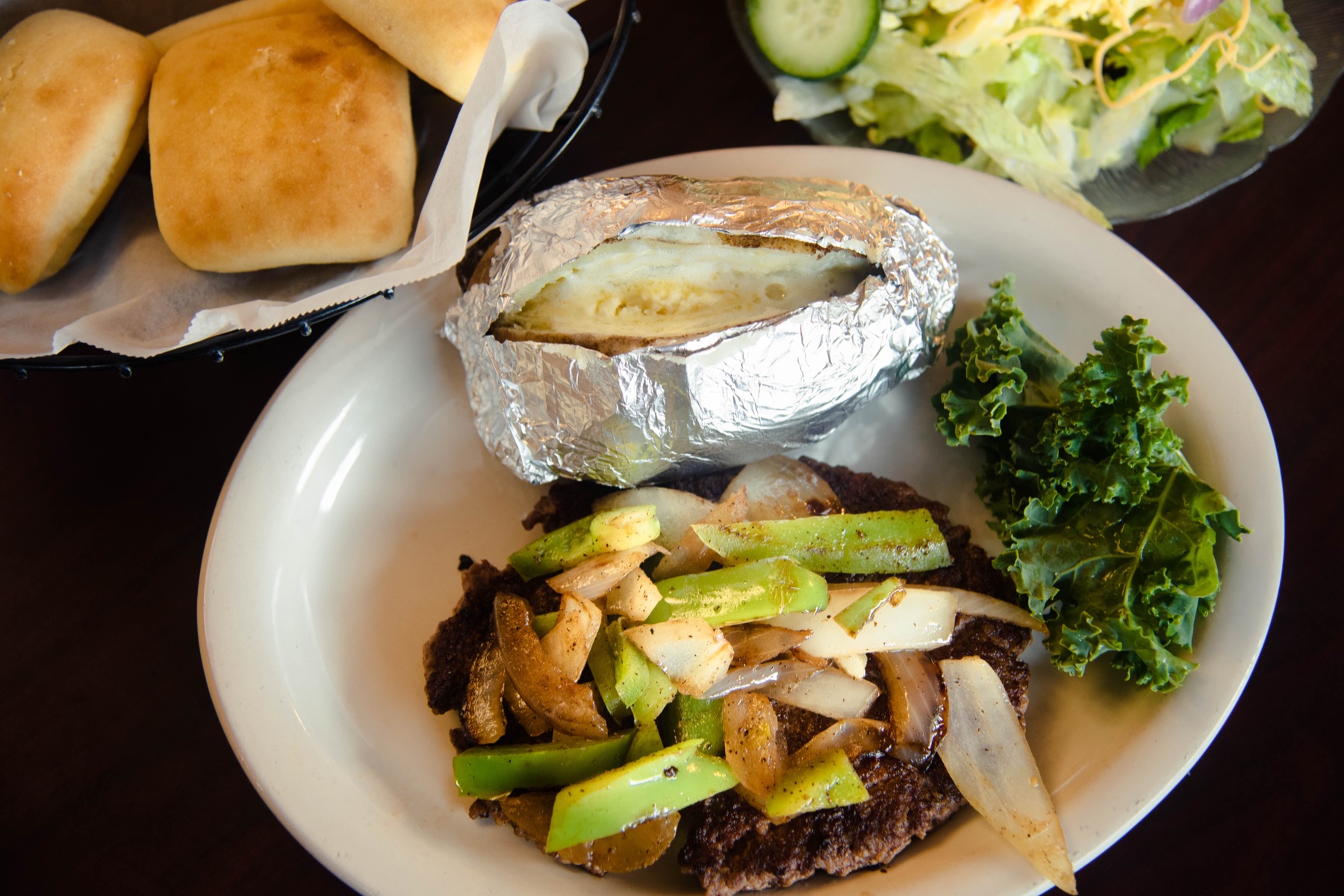 USDA choice beef, hand-cut in our own kitchen, cooked hard on the flat top. Served with two sides and bread.