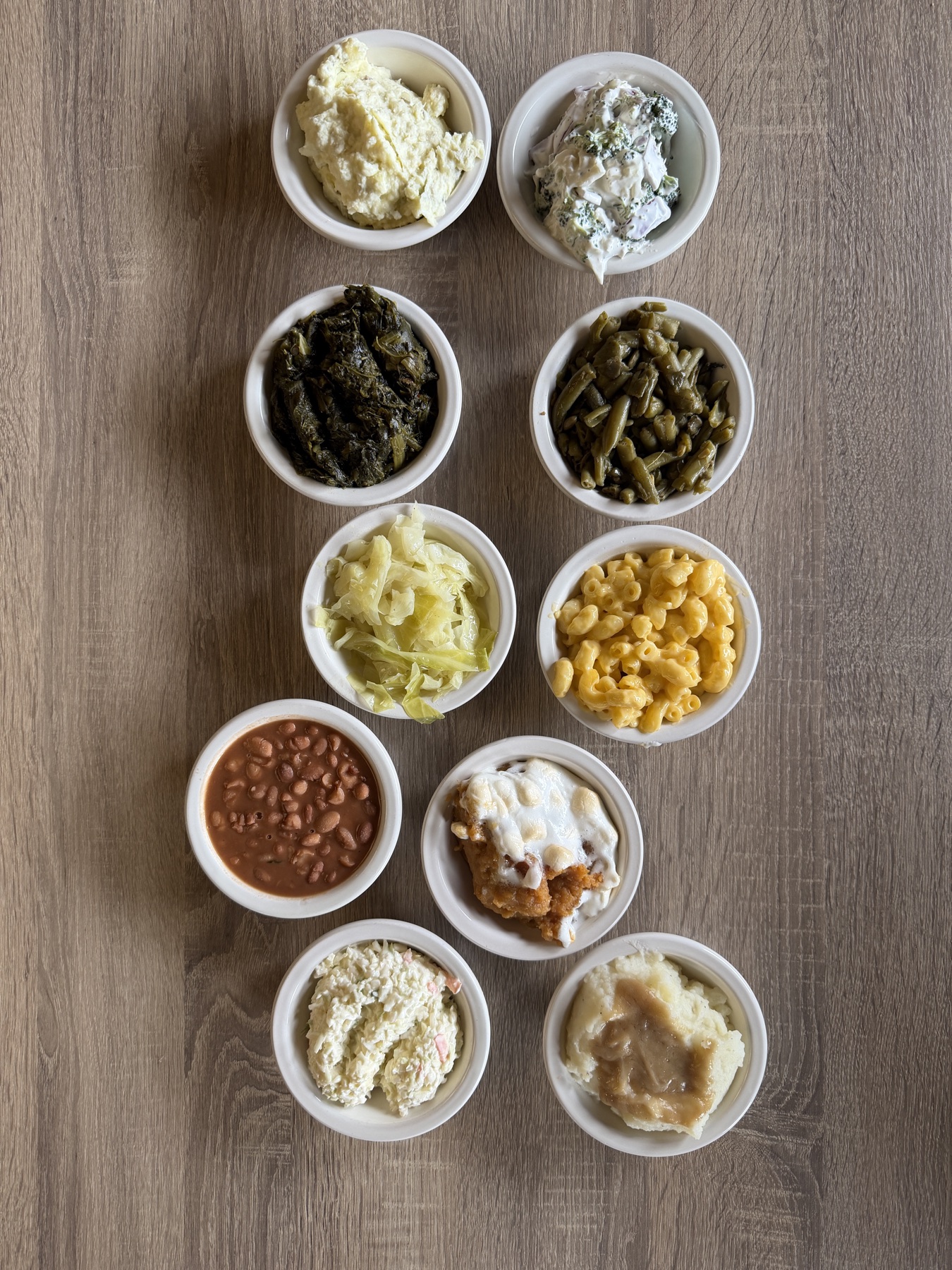 A different spread every single day — usually four meats, six vegetables, a cold salad bar, fresh homemade bread, and homemade cobbler & desserts. Call the day-of or check Joanna’s Facebook to see what’s on it. You can also order off the full menu at lunch — you don’t have to hit the buffet.
